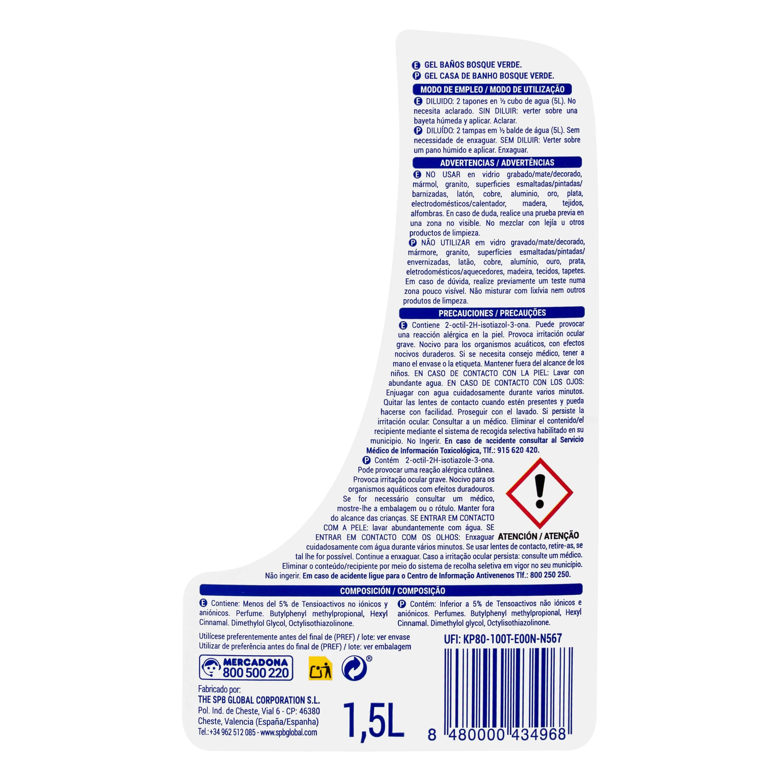 Limpiador Baños Bosque Verde en gel, producto de limpieza del hogar fabricado en España.