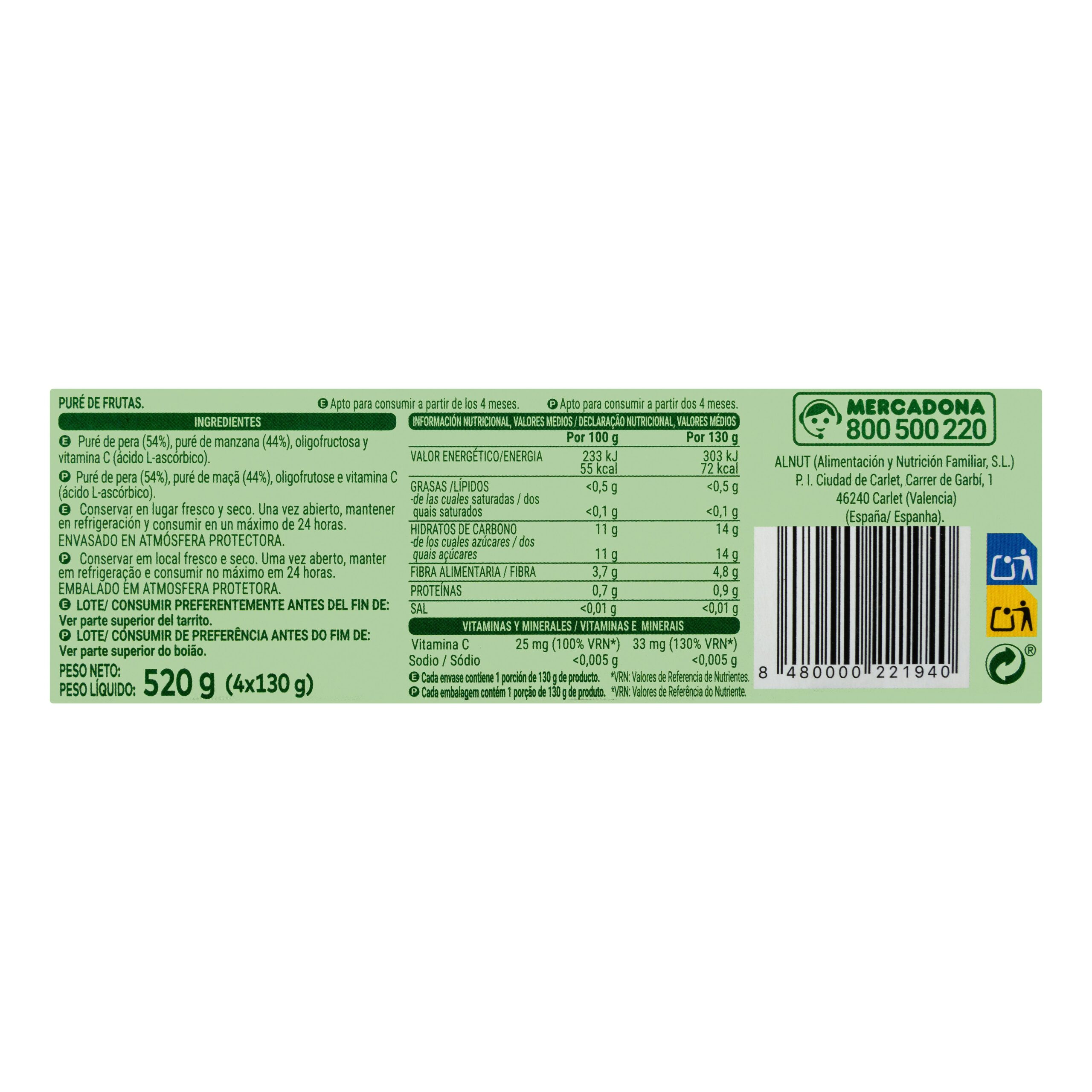 Papilla pera y manzana Hacendado +4 meses