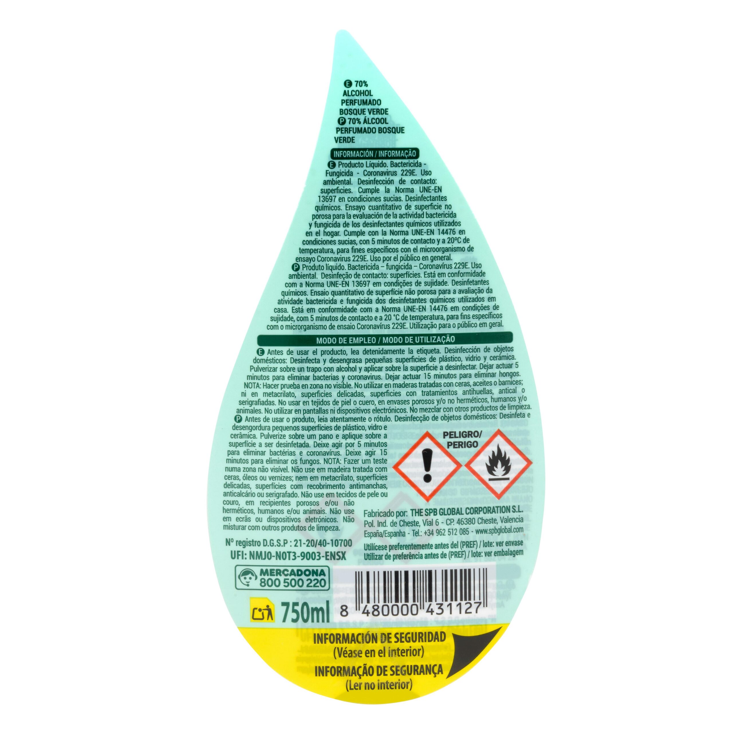 70% Alcohol limpieza hogar Bosque Verde, producto de limpieza del hogar fabricado en España.