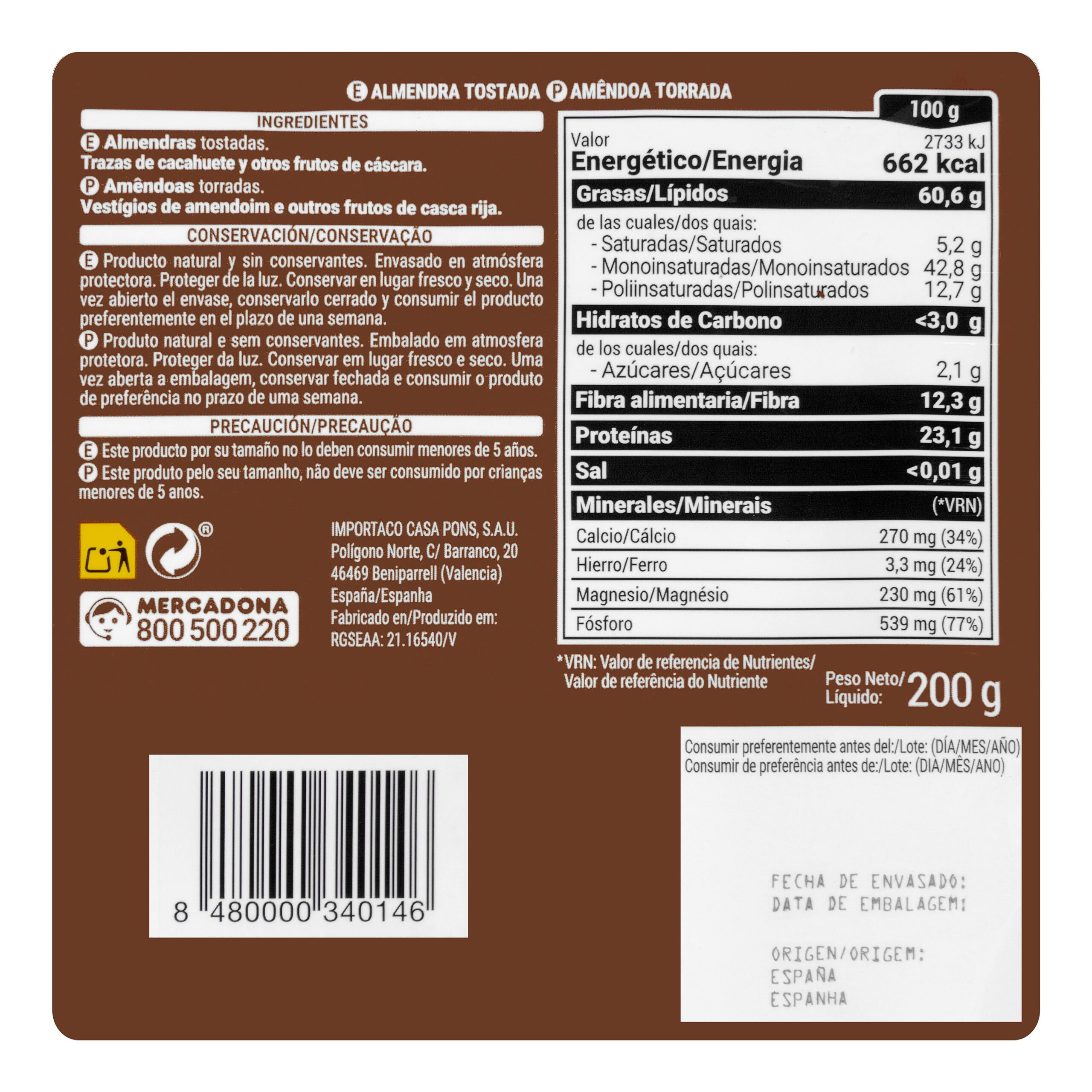 Almendra tostada 0% sal añadida con piel, ideal para disfrutar a diario como aperitivo o acompañamiento. Un clásico del mercado español.