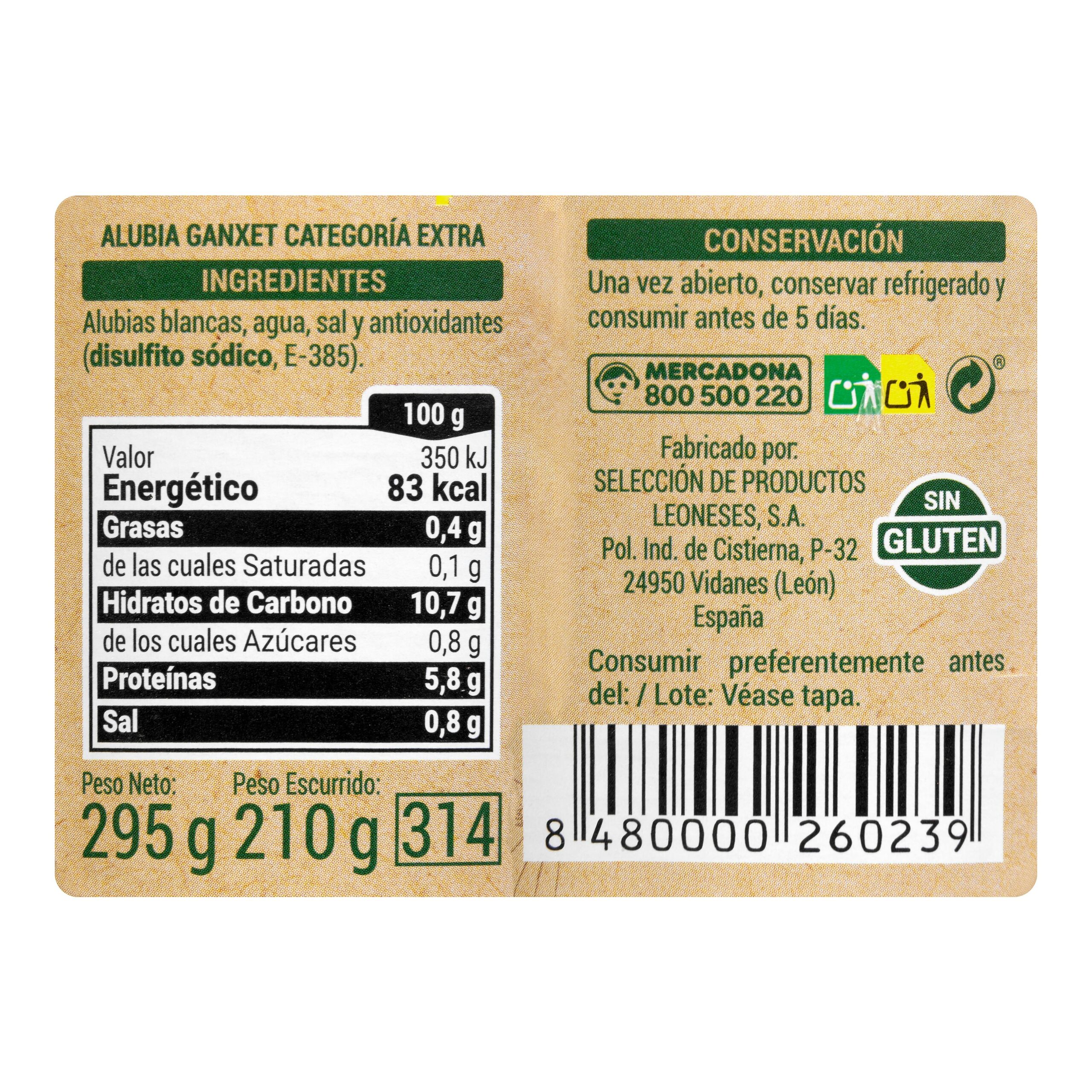 Alubia cocida Ganxet Hacendado típico del mercado español.