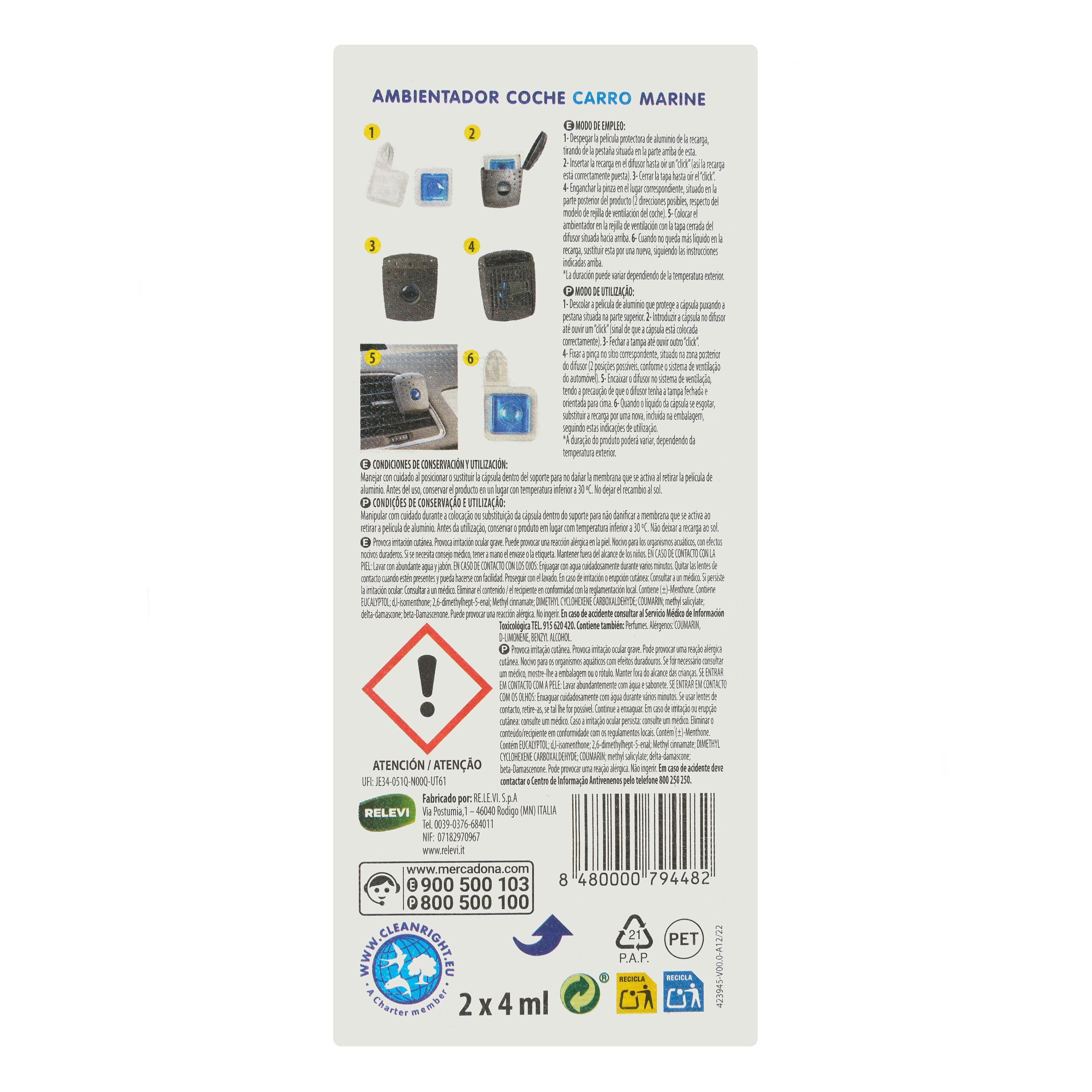 Ambientador coche Marine Bosque Verde, producto de limpieza del hogar fabricado en España.