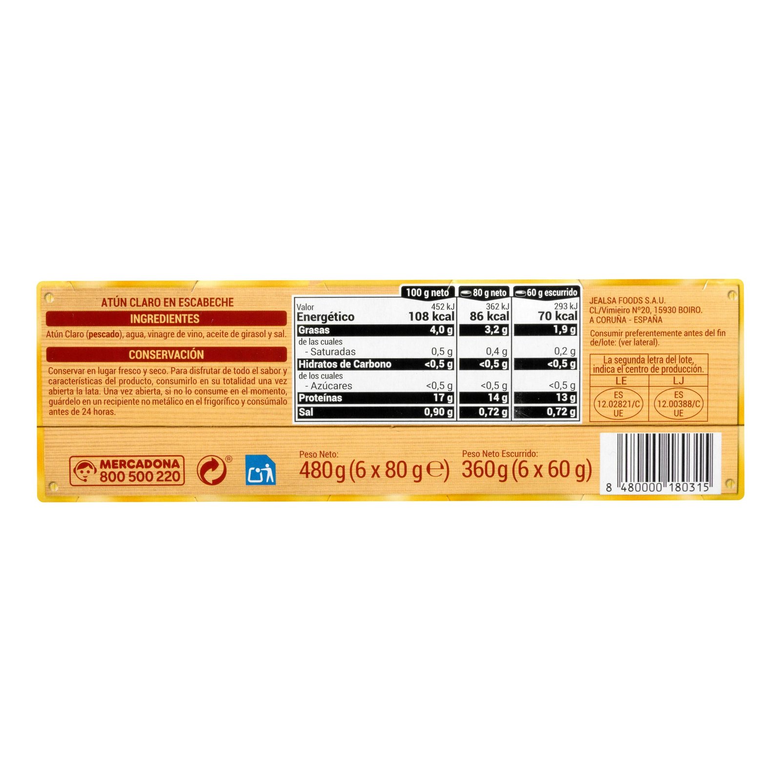 Atún claro en escabeche blanco Hacendado con auténtico sabor español.