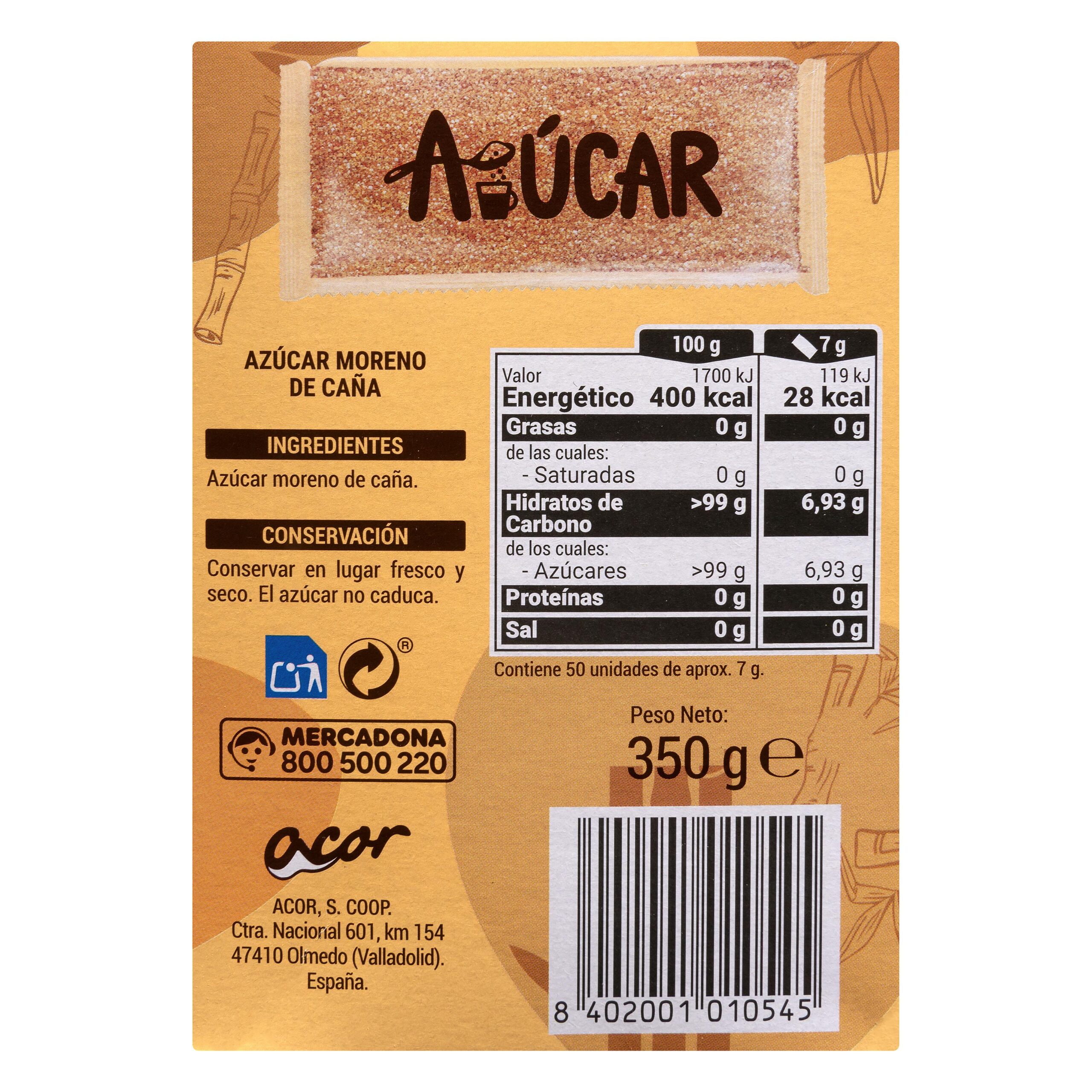 Azúcar moreno de caña en sobres Hacendado con auténtico sabor de España.