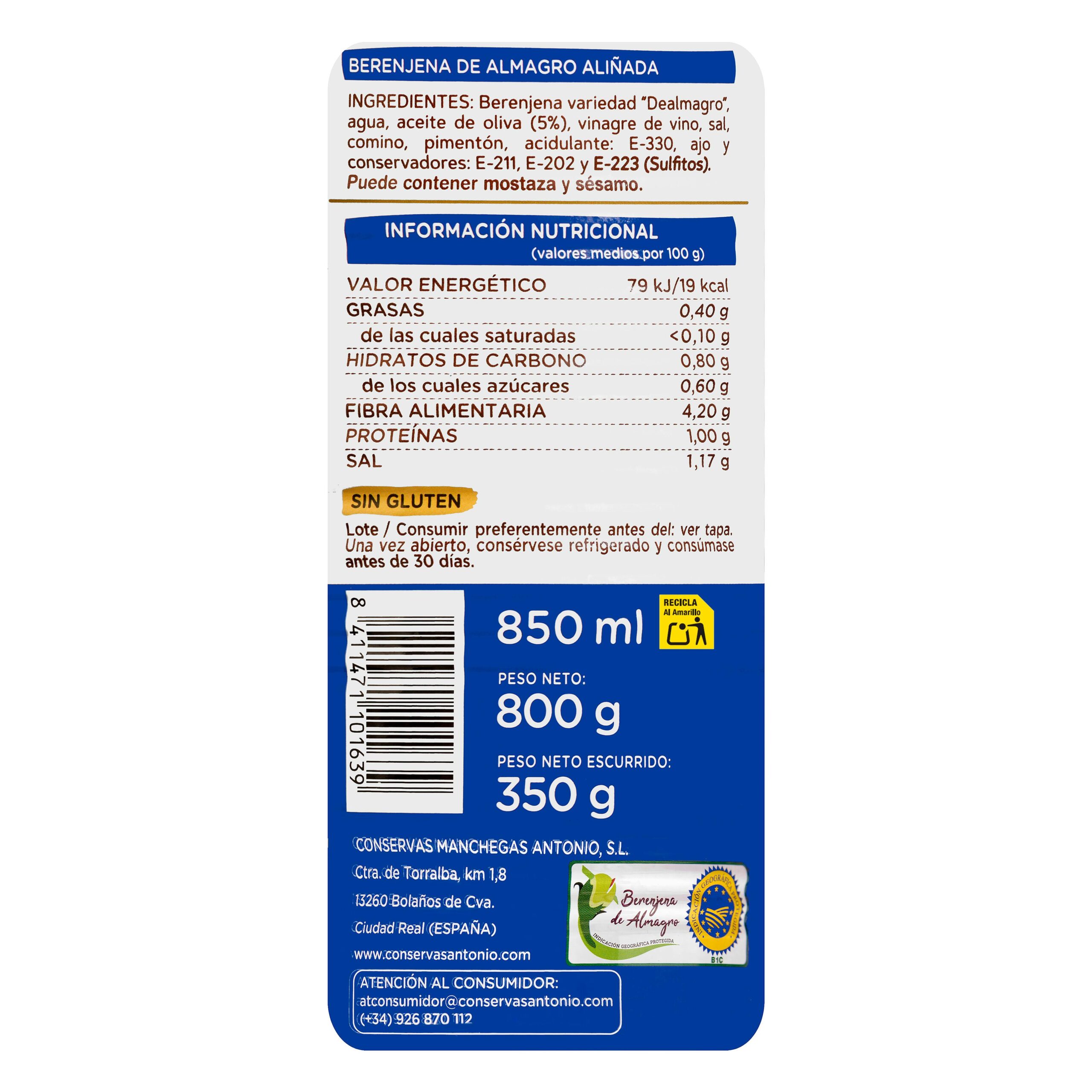 Berenjenas de Almagro aliñada Antonio, ideal para disfrutar a diario como aperitivo o acompañamiento. Un clásico del mercado español.