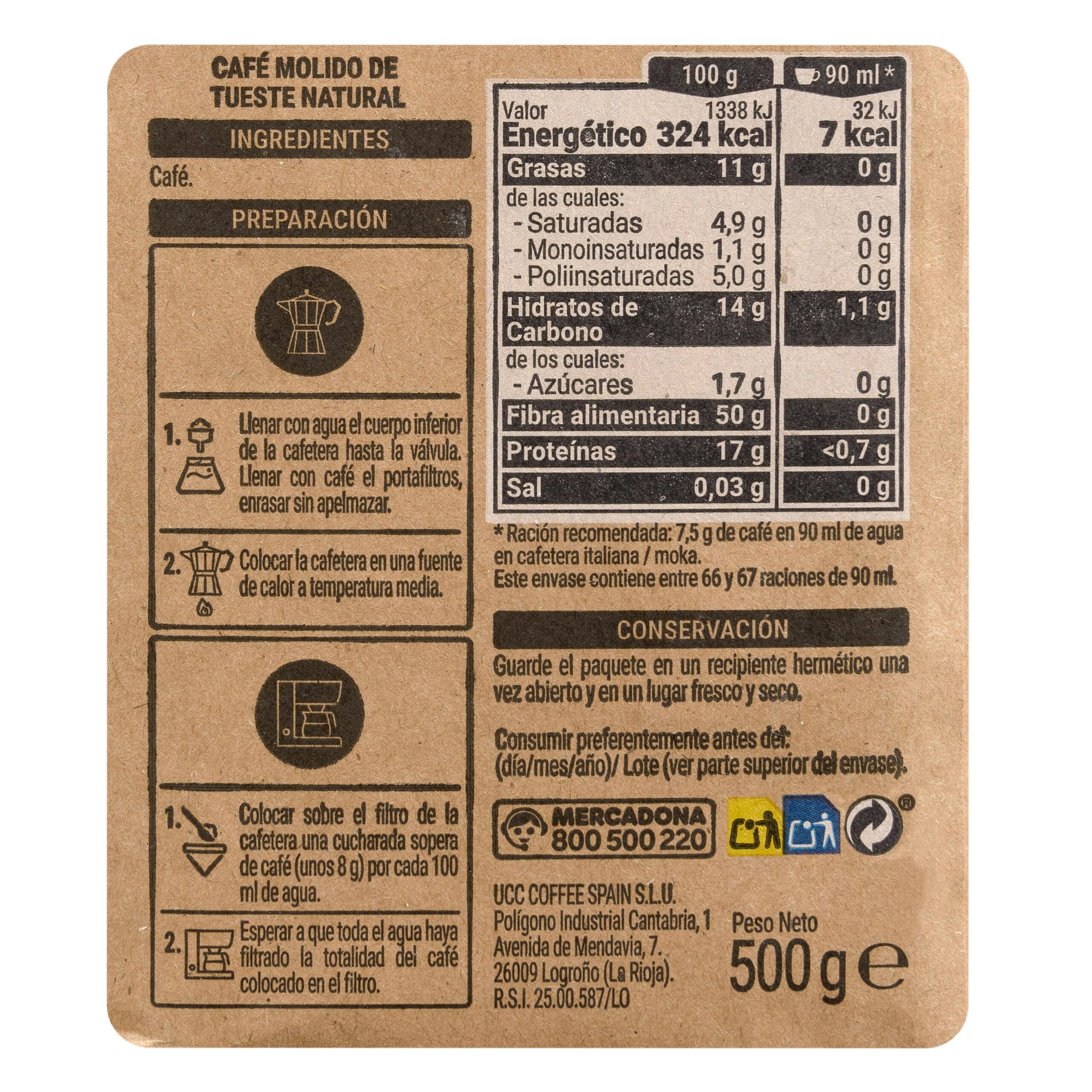 Café molido natural Hacendado, un producto típico del mercado español. Pertenece a la variedad de café molido, muy apreciada en España. Ideal para españoles que viven fuera de Europa y desean reencontrarse con los sabores de casa, o para europeos que quieren disfrutar de la auténtica tradición española.