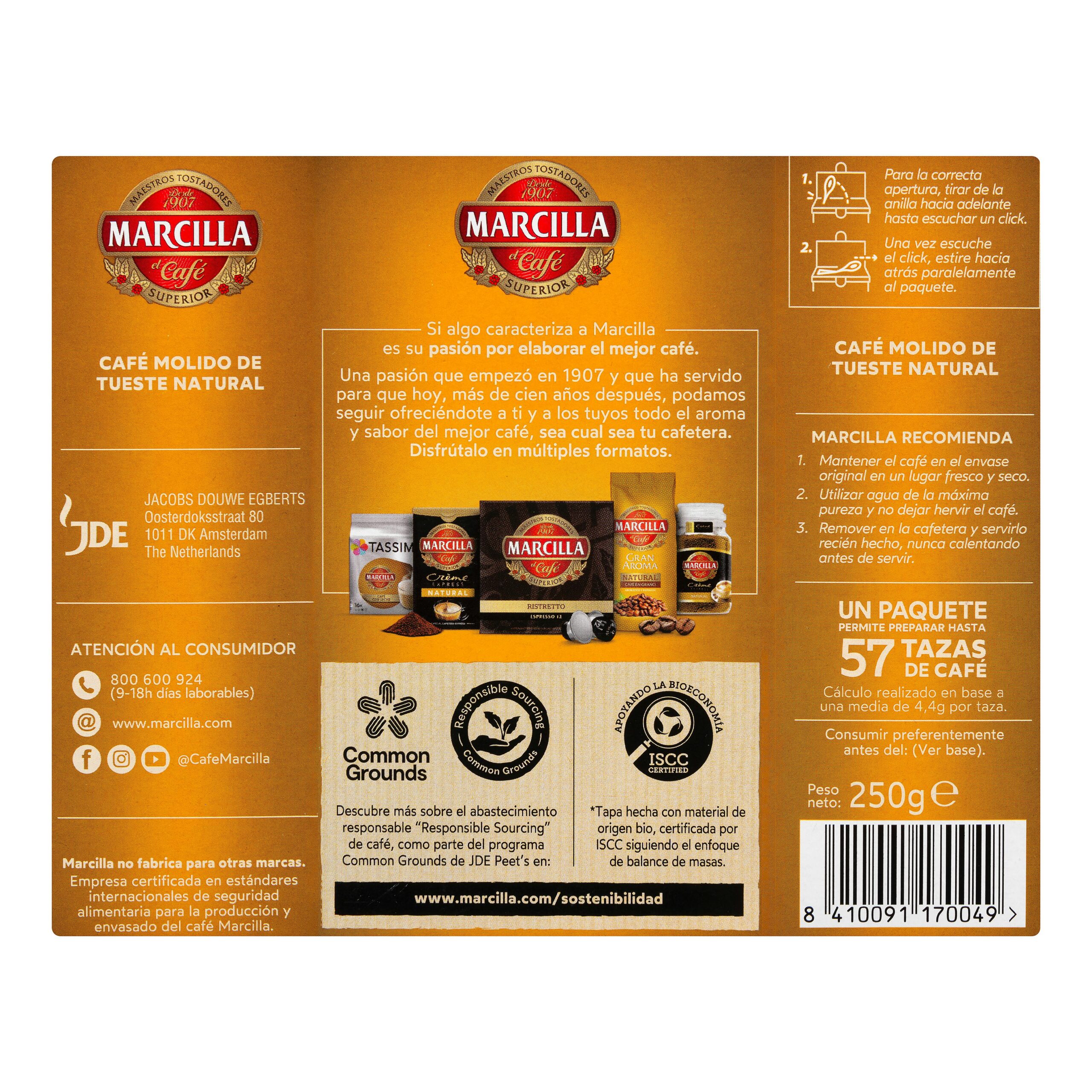 Café molido natural Marcilla gran aroma con auténtico sabor de España.