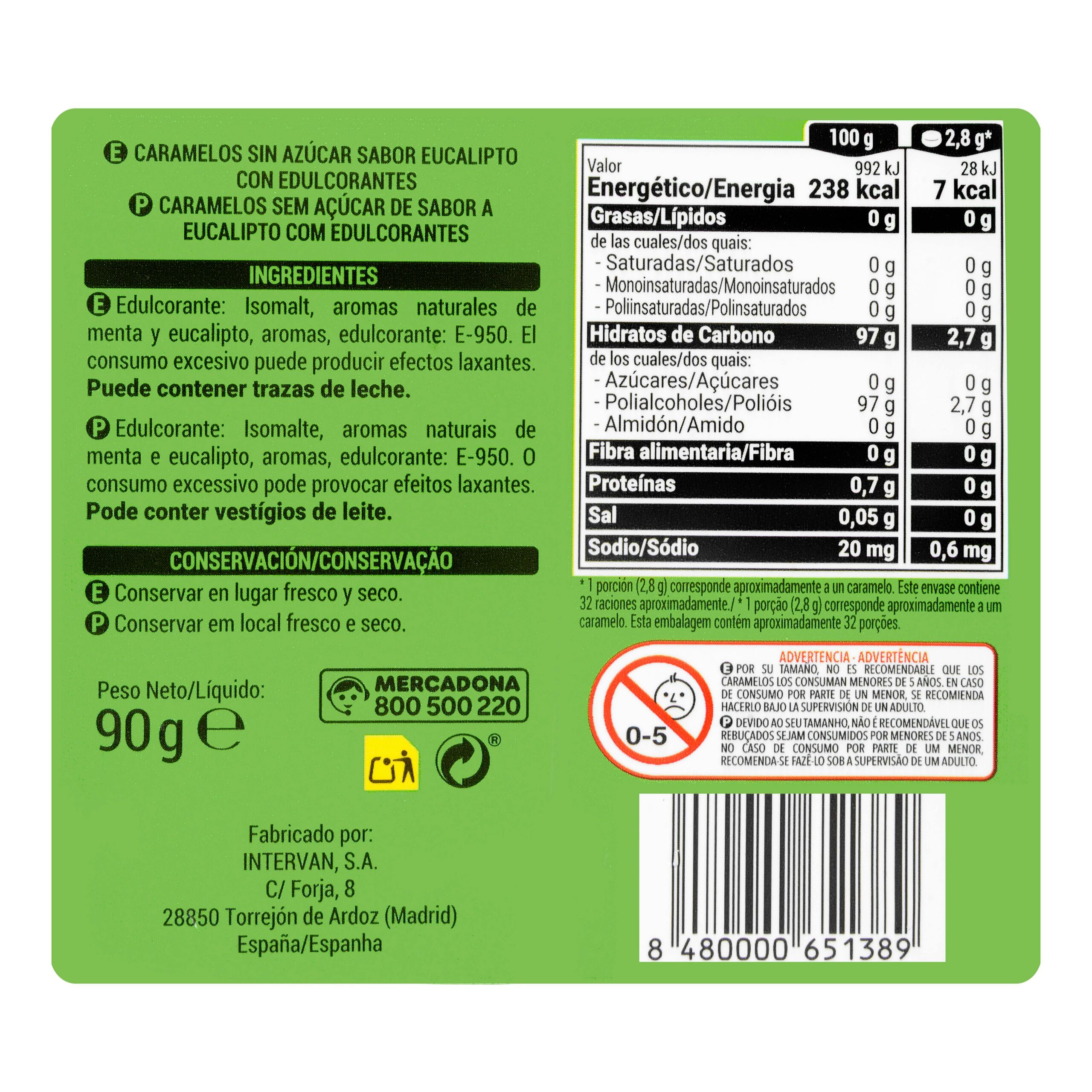 Caramelos sabor eucalipto y mentol Hacendado 0% azúcares