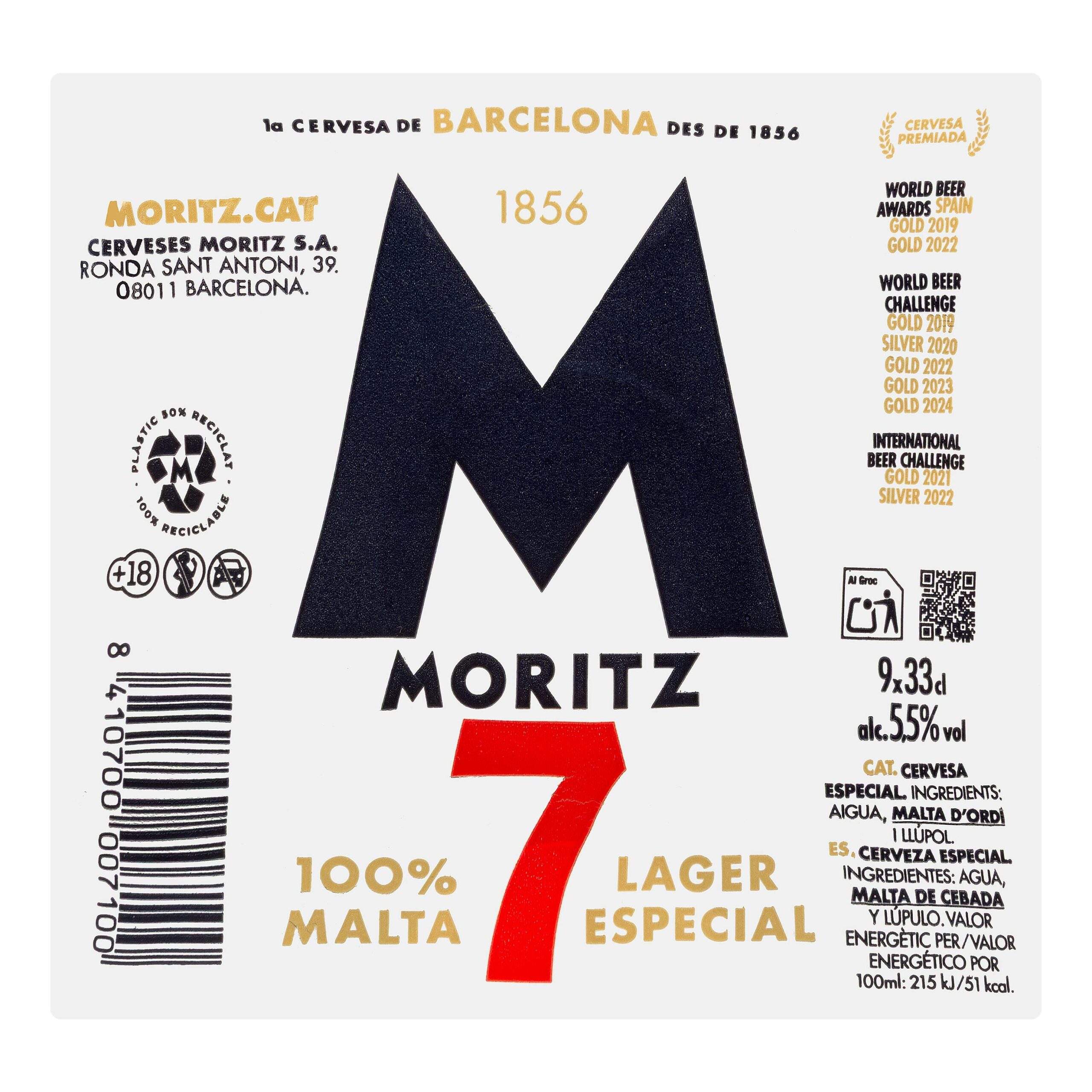 Cerveza 100% malta Moritz 7 elaborado en España, ideal para disfrutar y compartir momentos especiales con auténtico sabor español.