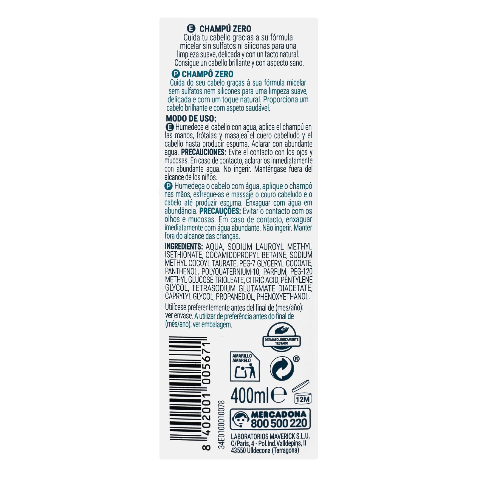 Champú Zero Deliplus todo tipo de cabello para el cuidado diario.