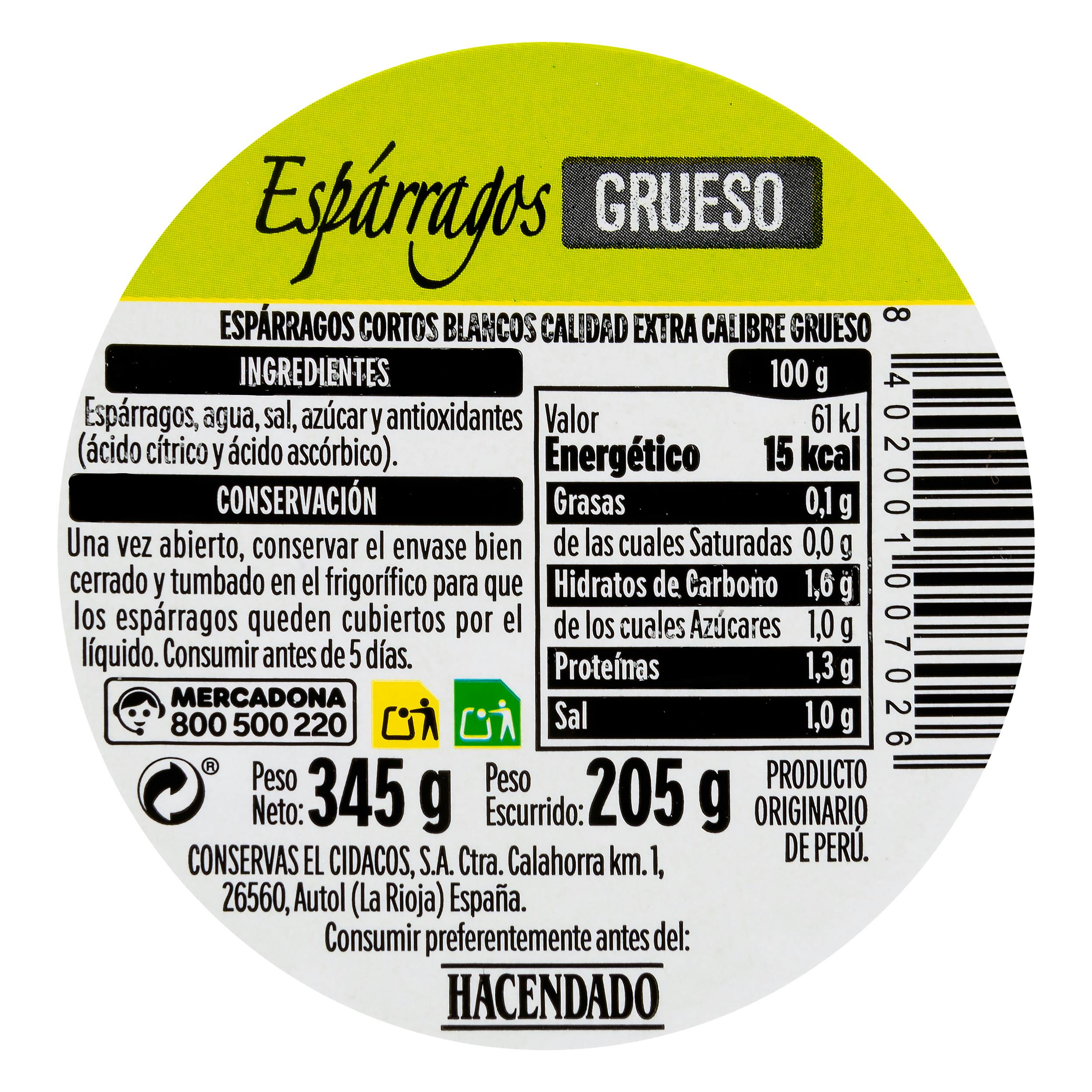 Espárragos blancos gruesos Hacendado cortos, un clásico del mercado español. Forma parte de la variedad de conservas verdura. Ideal para españoles fuera de Europa que buscan sabores de casa y para europeos que desean productos auténticos de España.