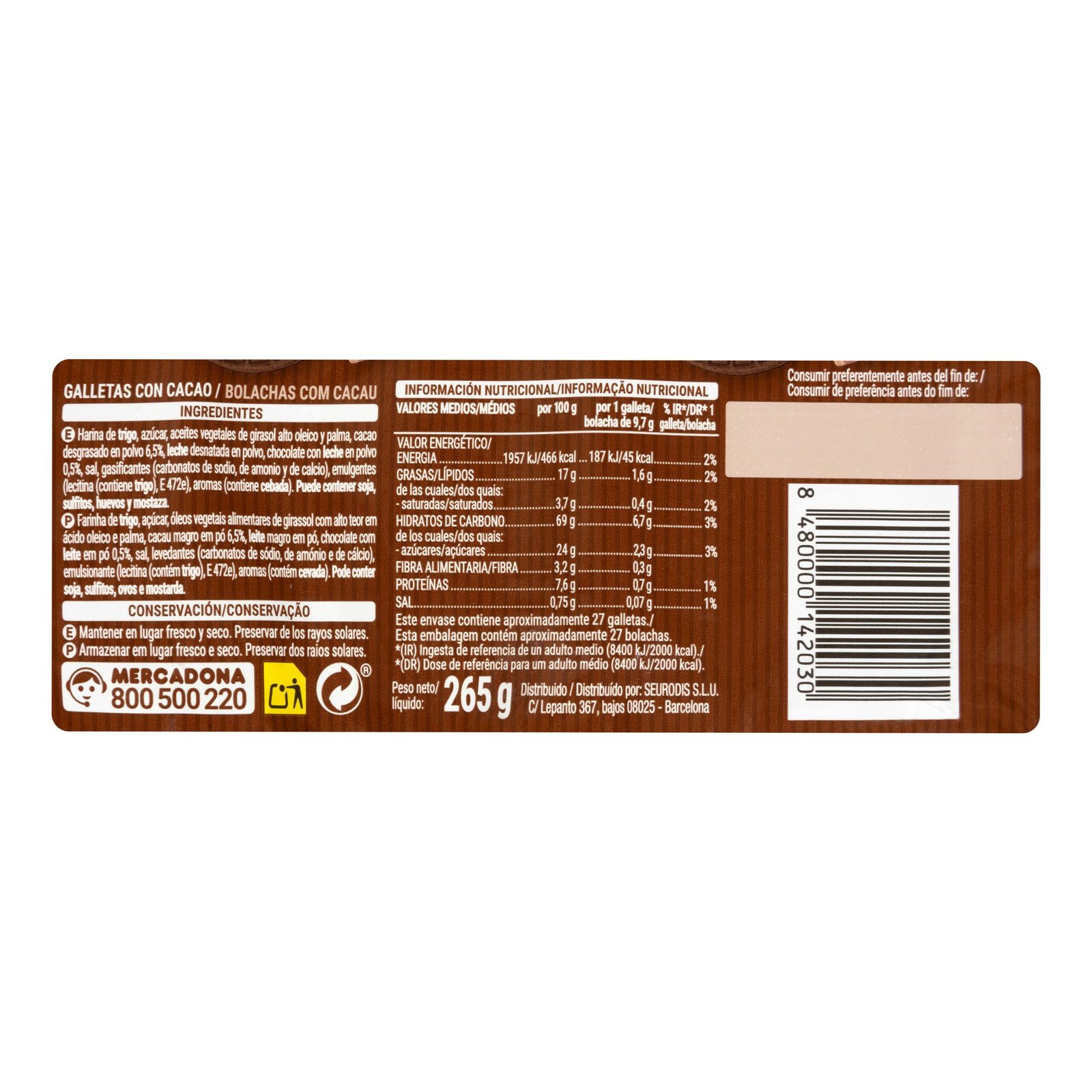 Galletas María choco Hacendado, un clásico del mercado español. Forma parte de la variedad de con chocolate y rellenas. Ideal para españoles fuera de Europa que buscan sabores de casa y para europeos que quieren disfrutar de productos auténticos de España.