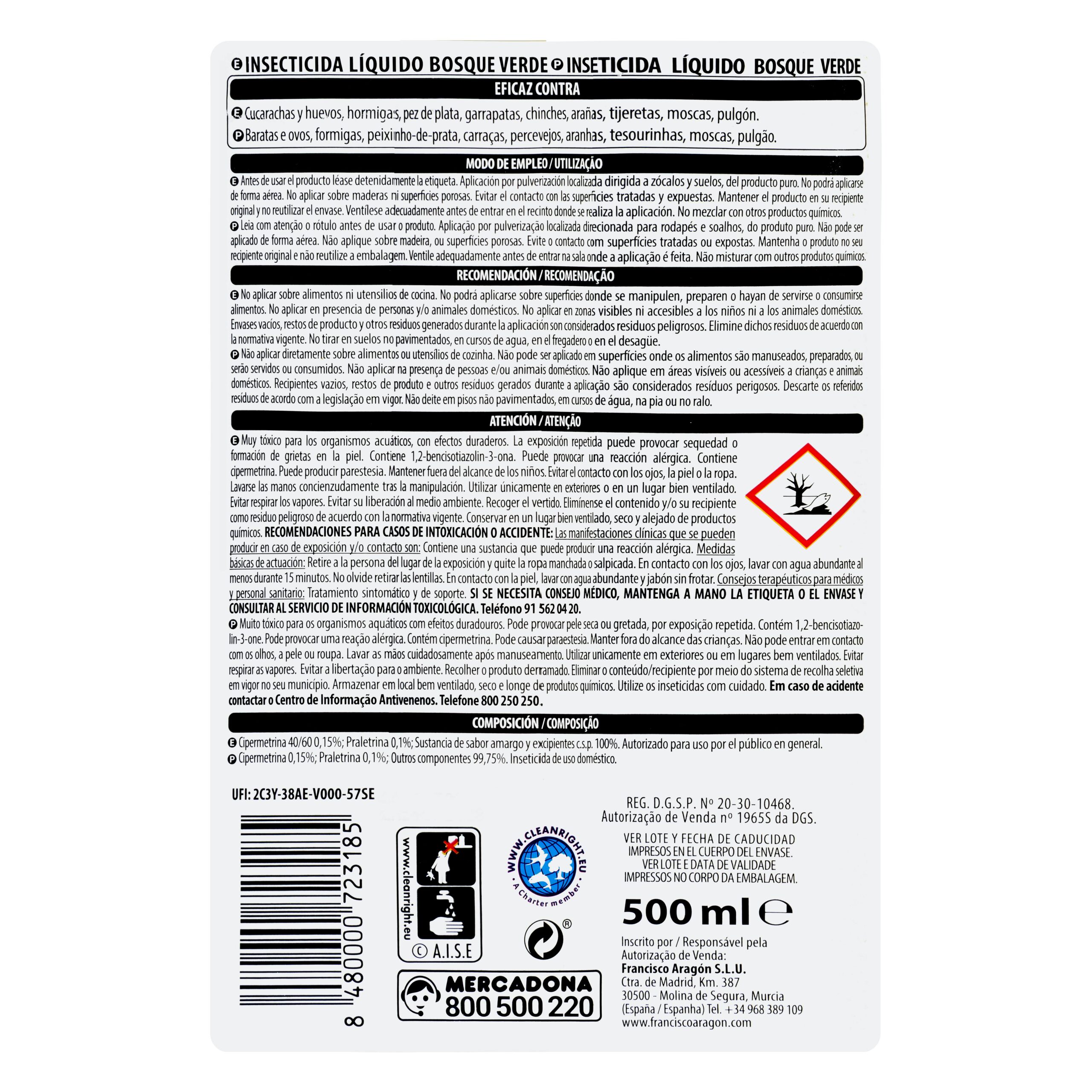 Insecticida líquido Bosque Verde, producto de limpieza del hogar fabricado en España.