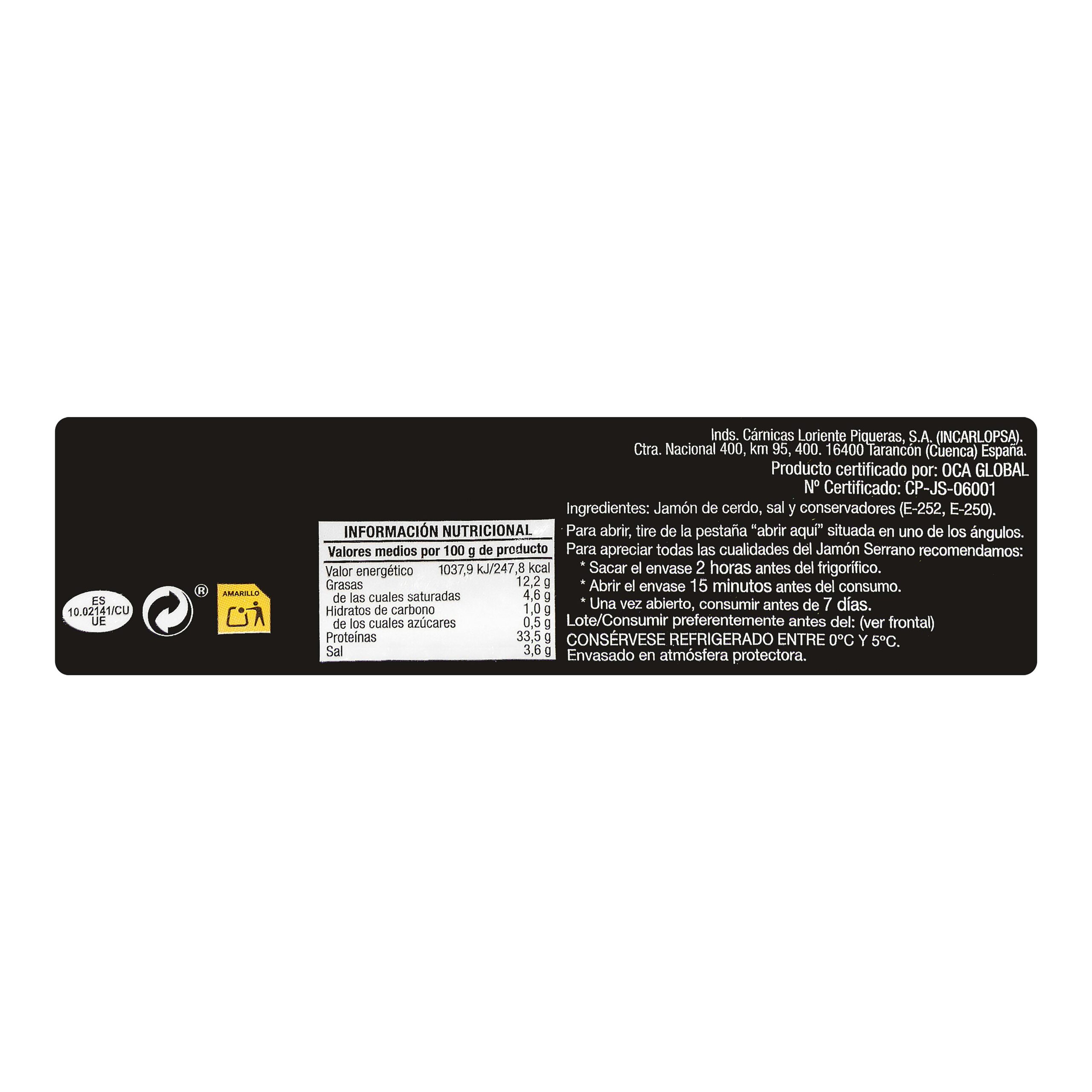 Jamón serrano Incarlopsa lonchas extrafinas, elaborado en España con ingredientes de primera calidad. Perfecto para degustar en tapas, tablas de embutidos o acompañado de un buen vino.