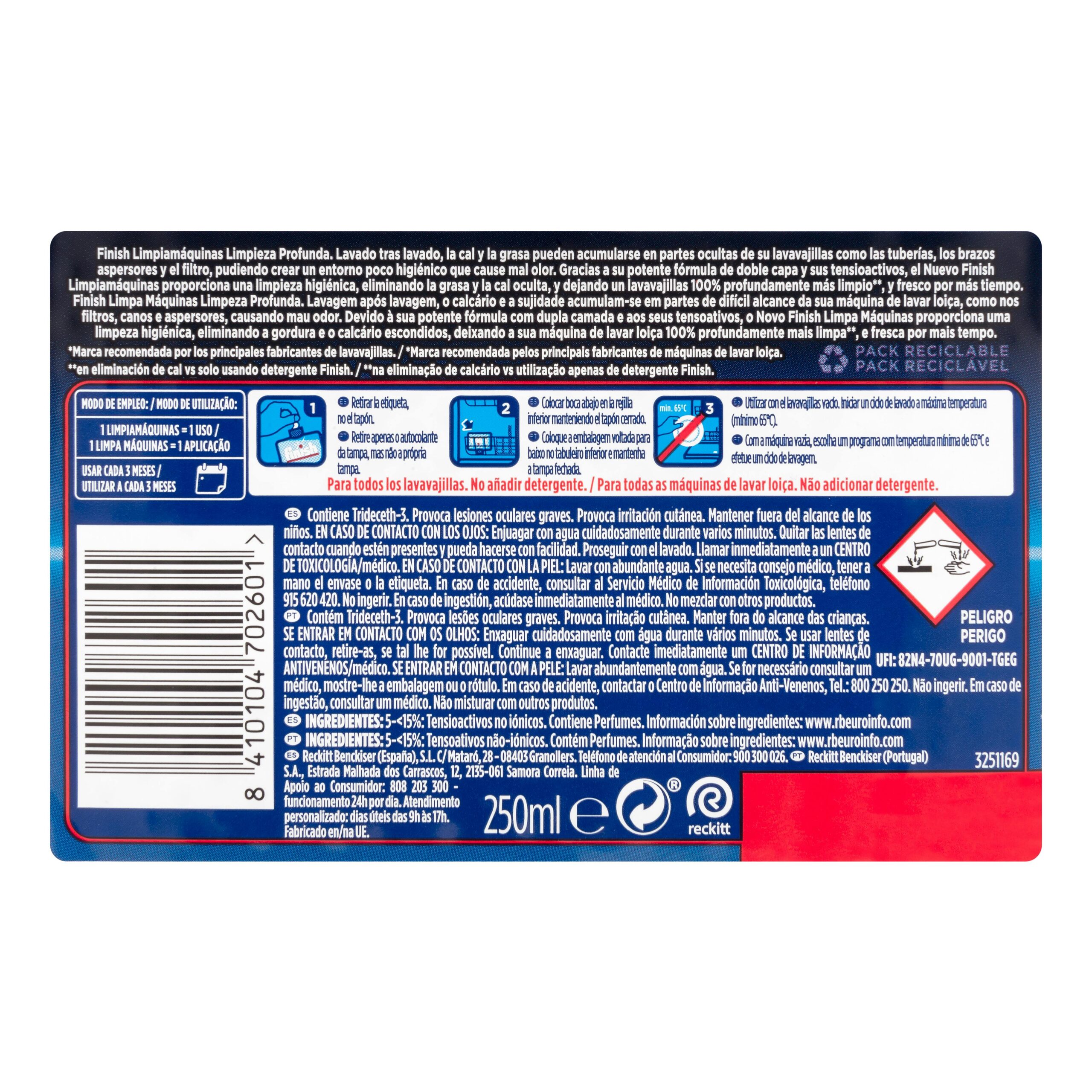 Limpiamáquinas lavavajillas Finish líquido, producto de limpieza del hogar fabricado en España.