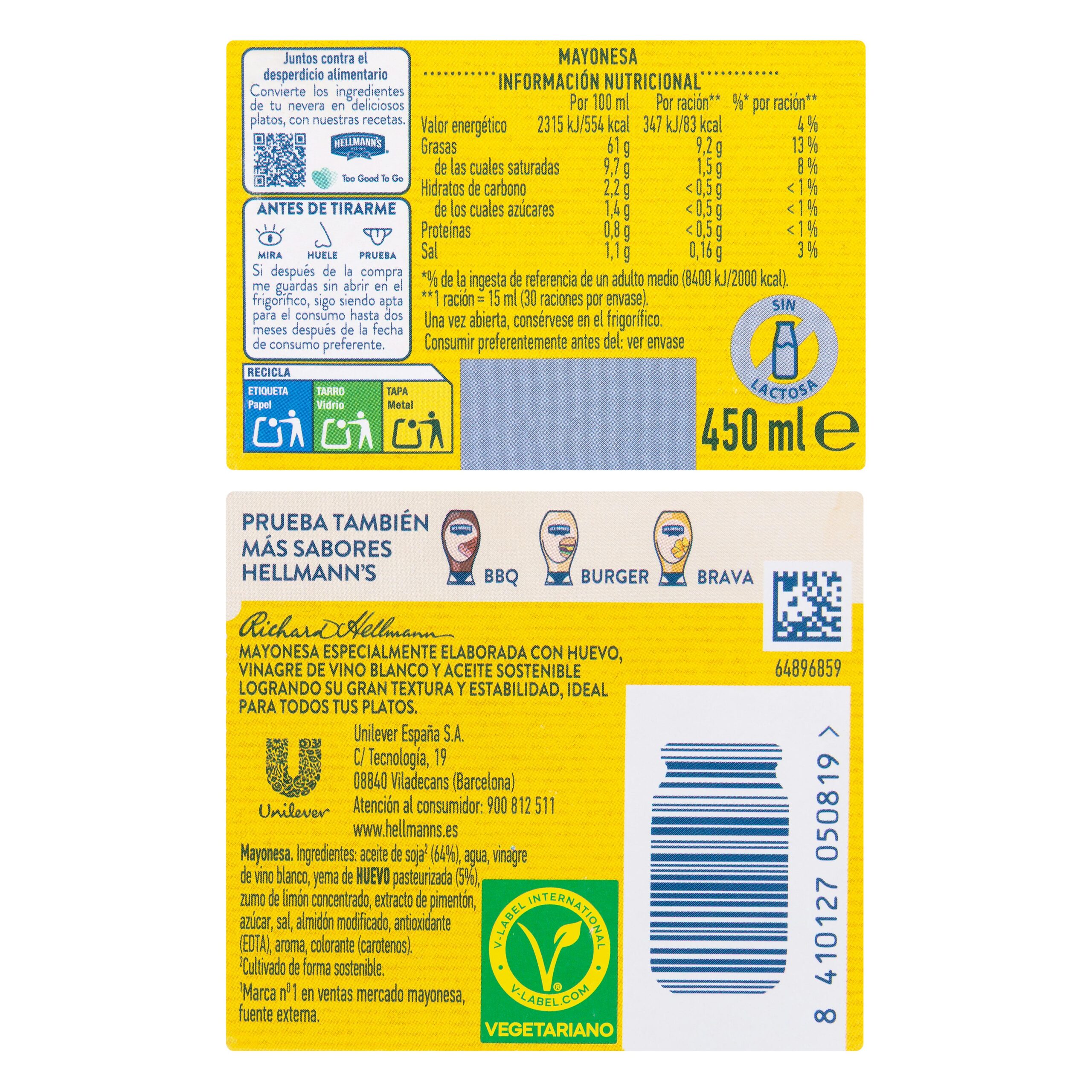 Mayonesa Hellmann’s forma parte de la despensa esencial de la cocina española, dentro de la familia mayonesa. Un imprescindible para acompañar tus platos y disfrutar del sabor de España en cualquier lugar. Formato: Tarro. Pensado para españoles que viven fuera y para europeos que disfrutan nuestra gastronomía.