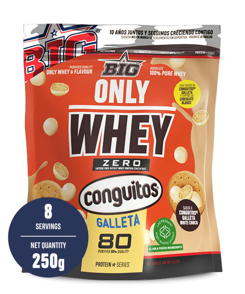Descubre la nueva ONLY WHEY ZERO Take Away sabor Conguitos Galleta White de BIG. Una proteína de suero de alta calidad, baja en azúcares y grasas, perfecta para disfrutar en cualquier momento y lugar. Con el autntico sabor Conguitos Galleta White, esta edicin especial te transporta a los sabor icnicos de Espaa, aportando todo lo que necesitas para apoyar tu rendimiento deportivo y recuperacin muscular. Su formato Take Away te permite llevarla cmodamente y prepararla al instante, ideal para quienes buscan nutricin de calidad sin renunciar al sabor. Cada dosis aporta protenas de alto valor biolgico, ayudando a mantener y desarrollar la masa muscular, mientras disfrutas de un sabor irresistible.