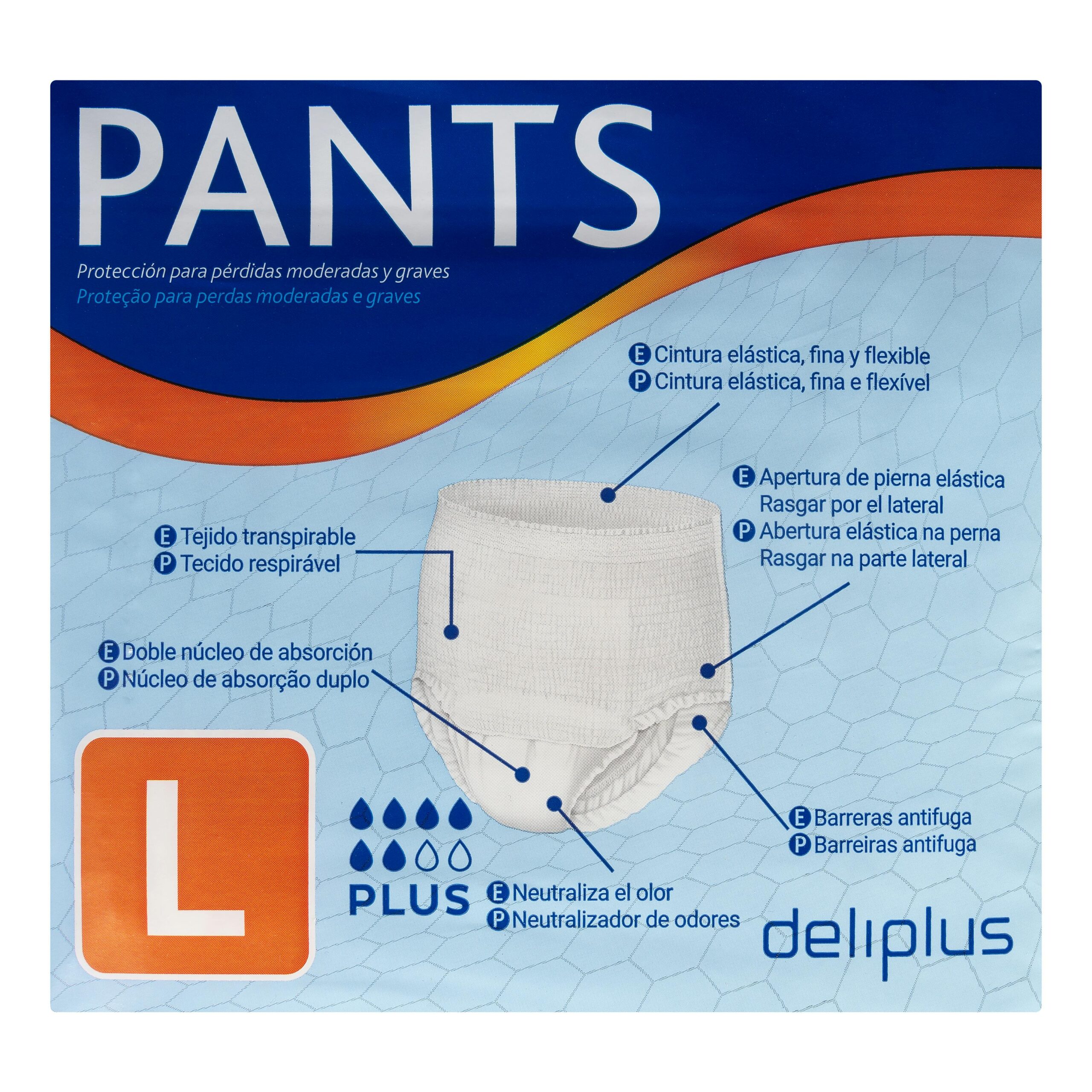 Pañal adulto braguita talla L Deliplus Pants Plus, pensado para tu higiene y cuidado personal de cada día. Fácil de usar y adecuado para la rutina habitual.