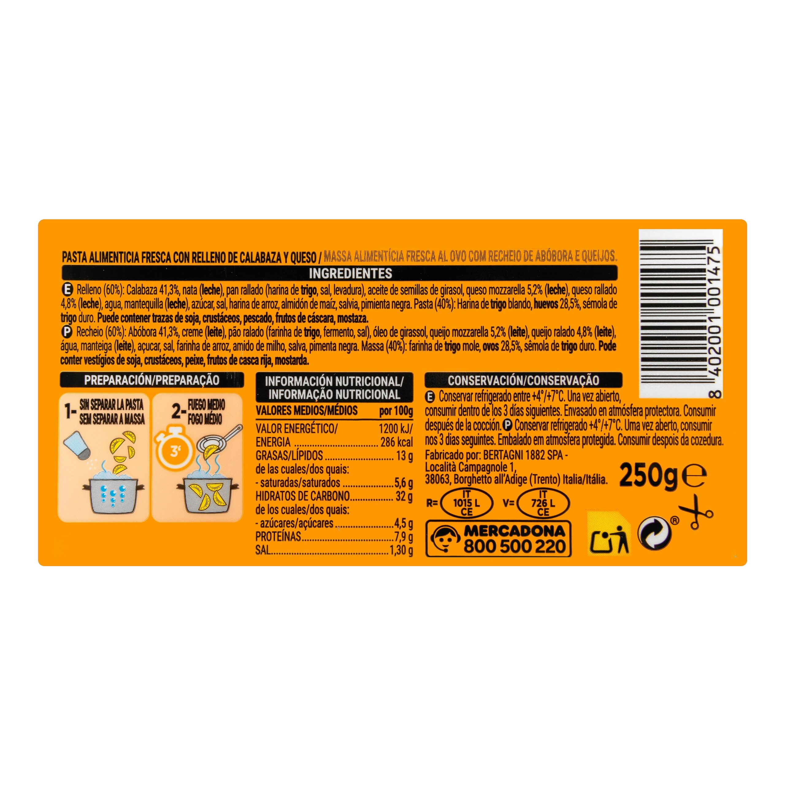 Pasta fresca medialunas calabaza Hacendado típico del mercado español.