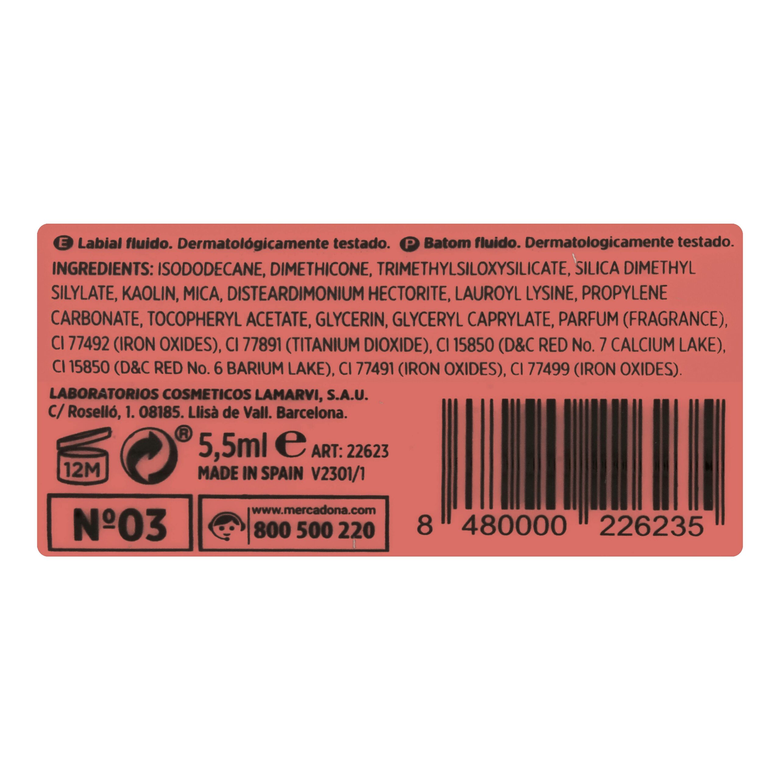 Pintalabios Fluido Mate Deliplus 03 terracota, maquillaje del mercado español. Tipo: pintalabios mate. Ideal para españoles fuera de Europa y europeos que buscan productos auténticos de España.