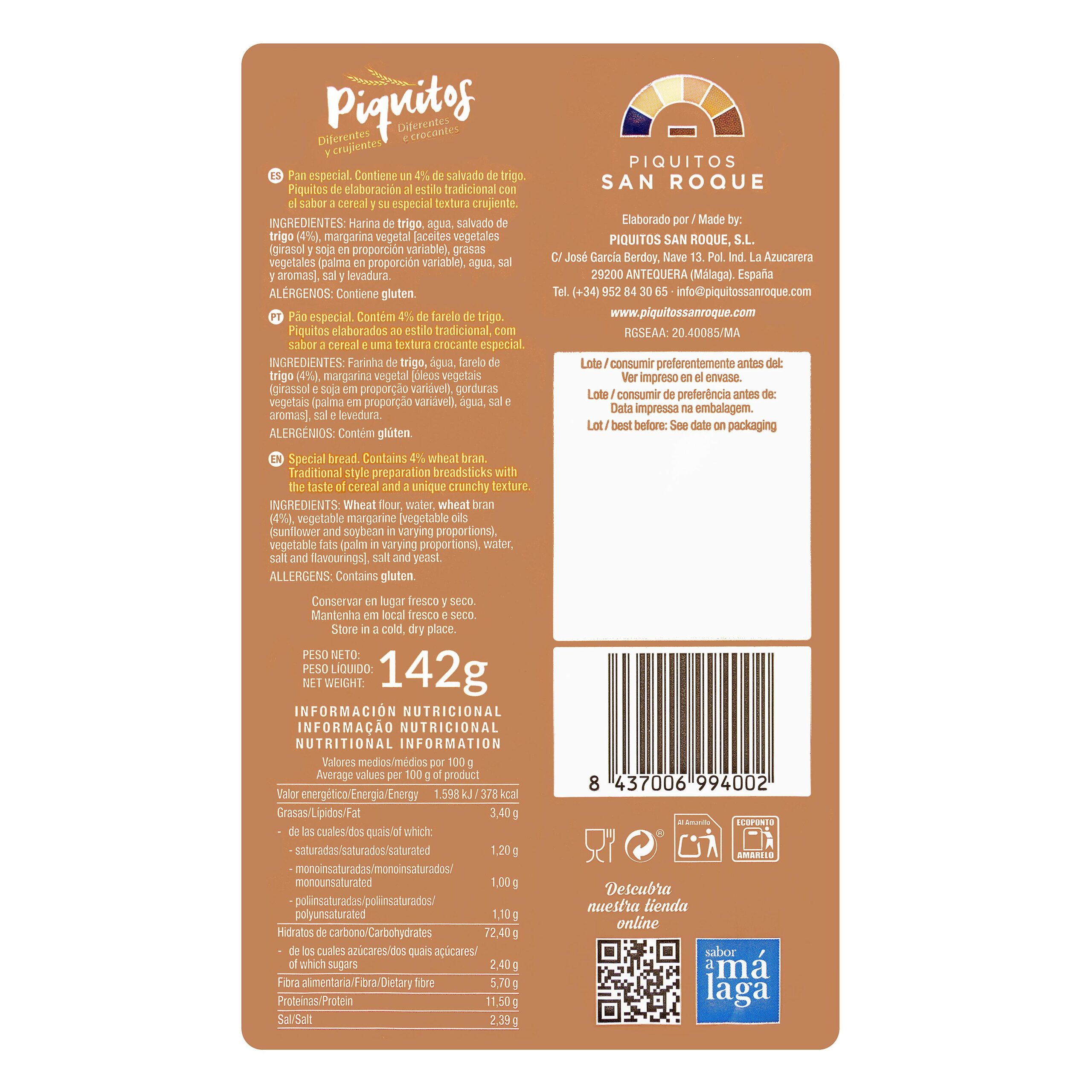 Piquitos con salvado San Roque. Picos andaluces ideales para tapas. Producto clásico español, ideal para picar, acompañar quesos, embutidos o ensaladas. Formato aproximado: 0.142 kg. Apto para clientes en Europa que buscan sabores y formatos habituales en España.