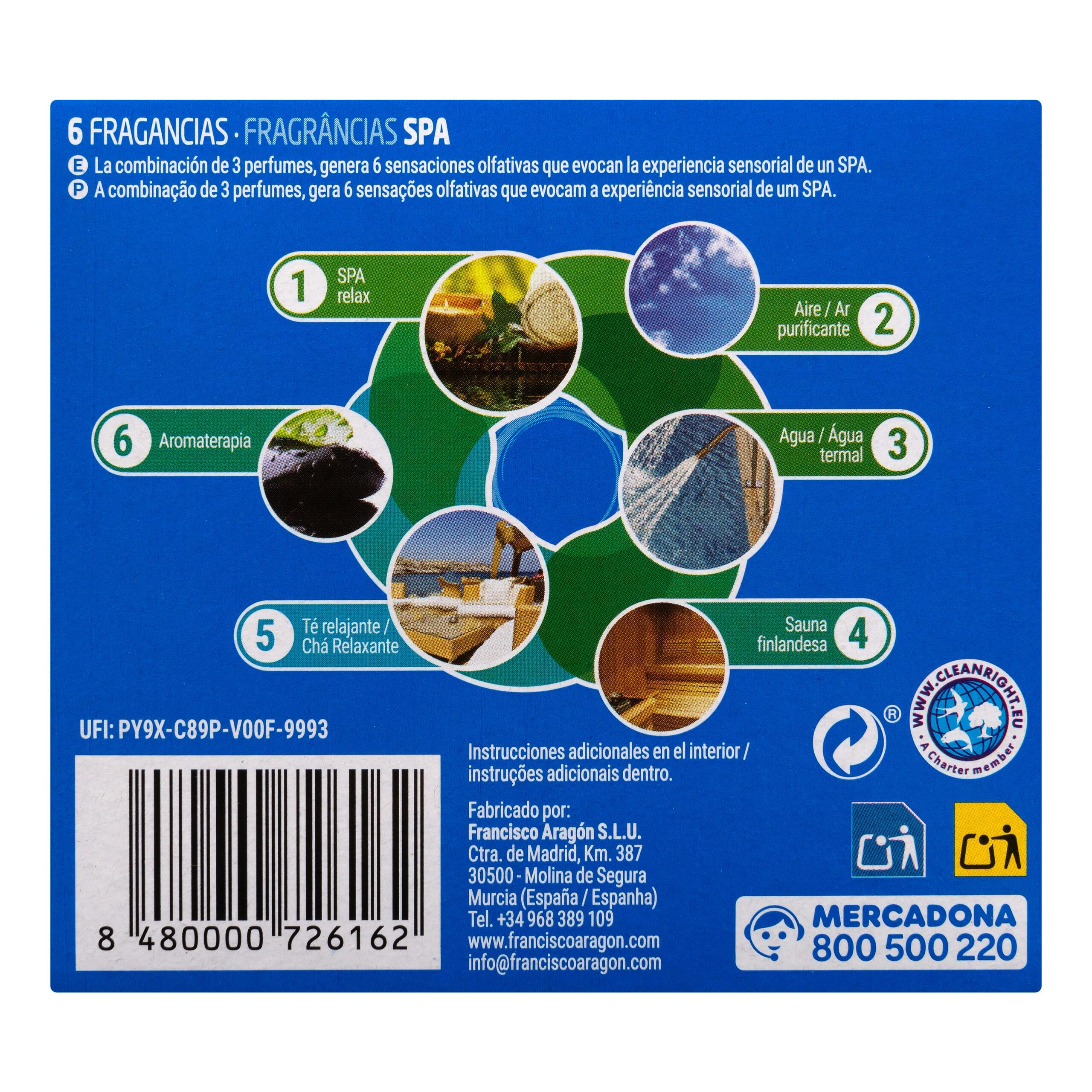 Recambio ambientador eléctrico Spa 6 fragancias Bosque Verde, producto de limpieza del hogar fabricado en España.