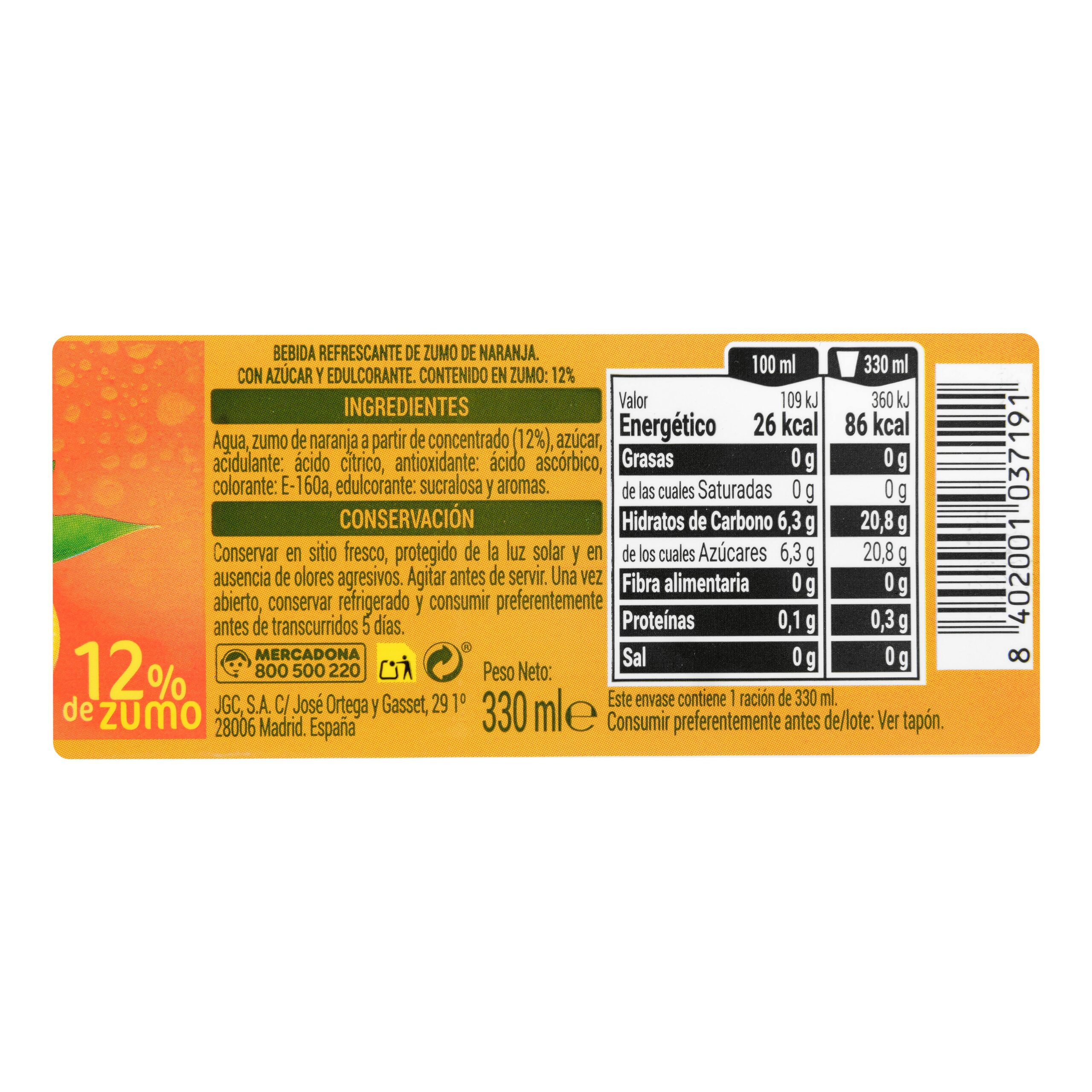Refresco de naranja sin gas. Bebida refrescante del mercado español. Disfrútala fría en tus comidas o como refresco diario.