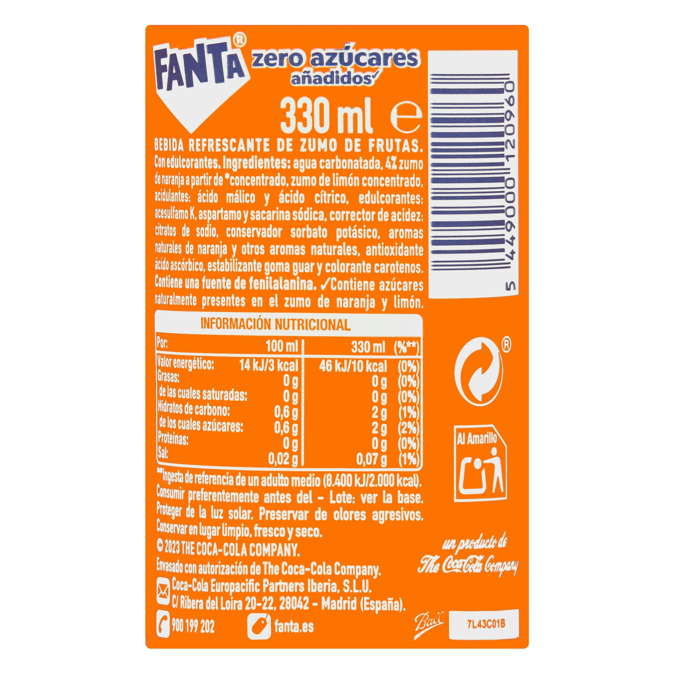 Refresco Fanta naranja zero azúcares añadidos. Bebida refrescante del mercado español. Disfrútala fría en tus comidas o como refresco diario.