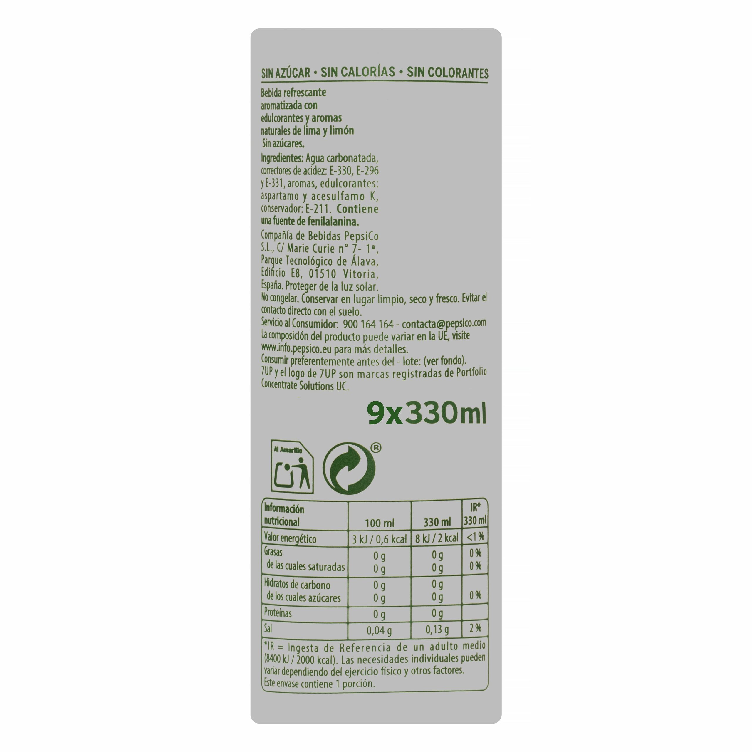 Refresco lima limón 7 Up Zero azúcar. Bebida refrescante del mercado español. Disfrútala fría en tus comidas o como refresco diario.