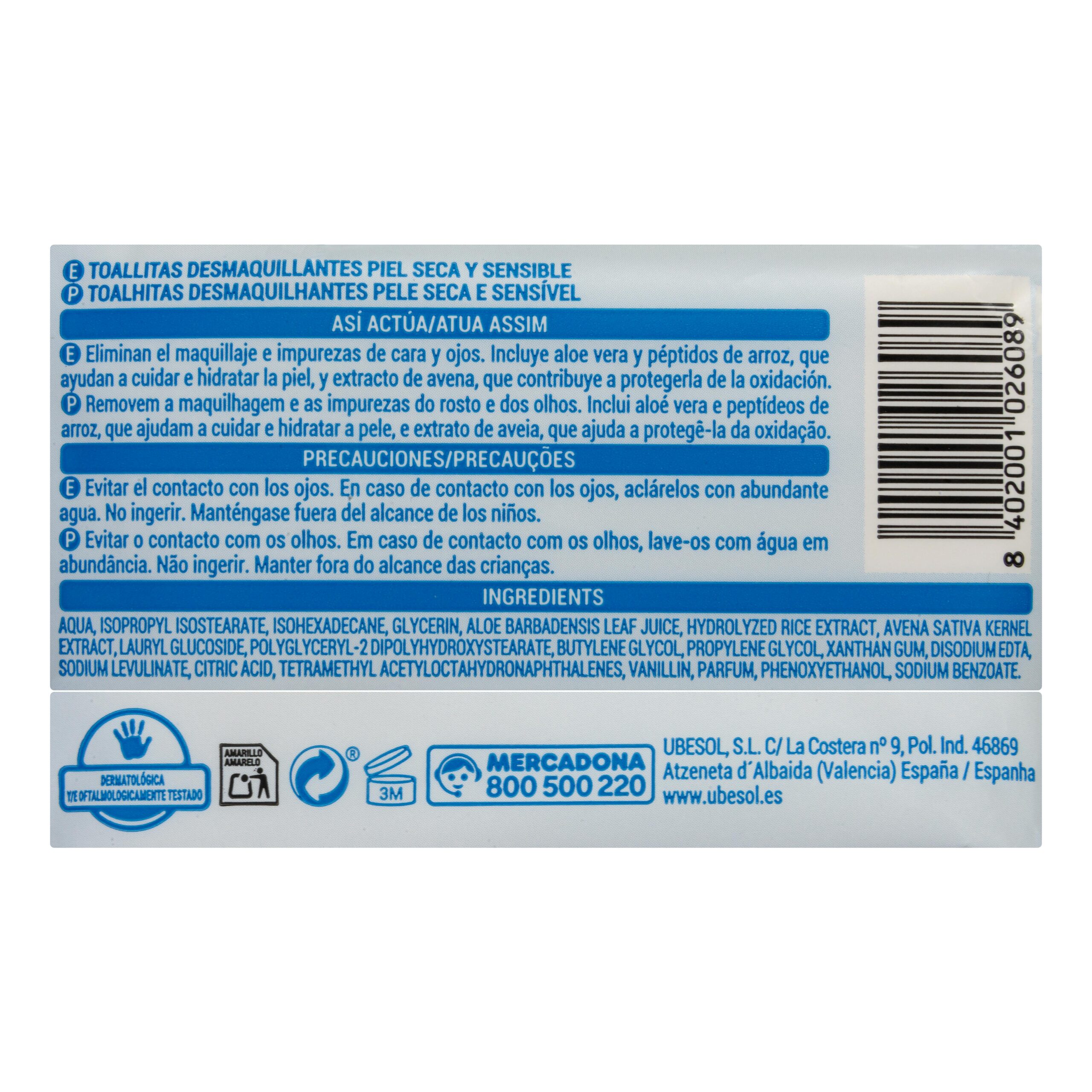 Toallitas desmaquillantes cara y ojos Deliplus piel seca y sensible