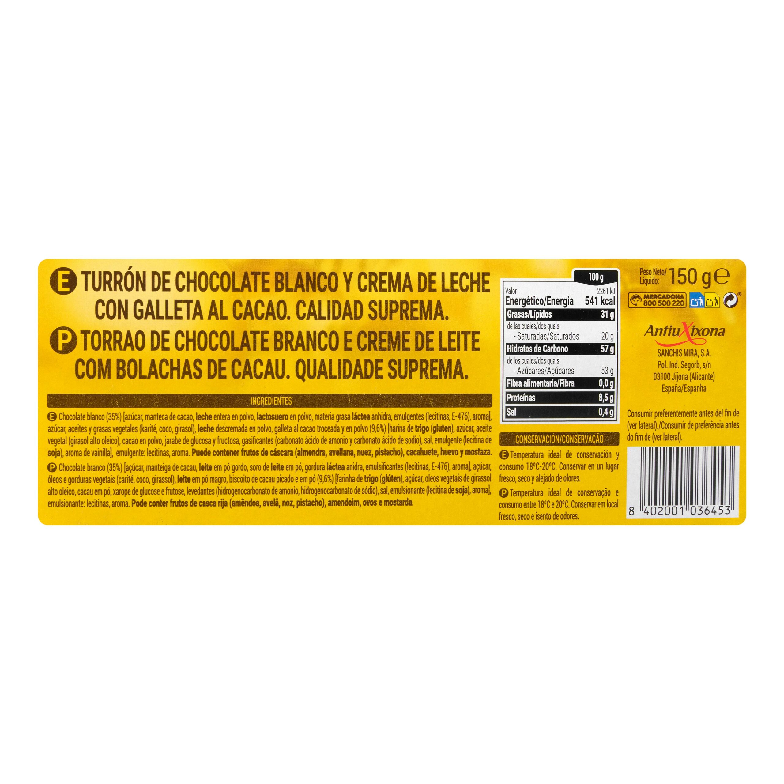 Turrón de chocolate blanco con galleta Caocream Hacendado. Authentic Spanish taste in every bite. Perfect for gifts and enjoyment across Europe.