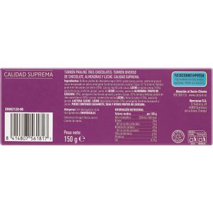 Turrón tres chocolates praliné de CONSUM, un auténtico turrón español con sabor artesanal y la calidad que distingue a los dulces navideños de España.