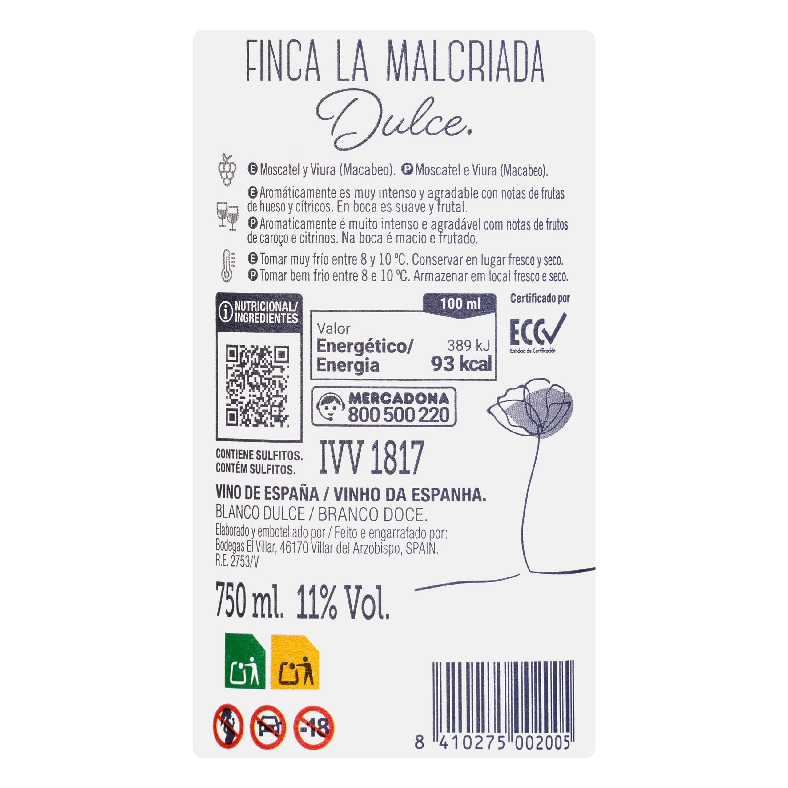 Vino blanco D.O Valencia Finca La Malcriada dulce elaborado en España, ideal para disfrutar y compartir momentos especiales con auténtico sabor español.