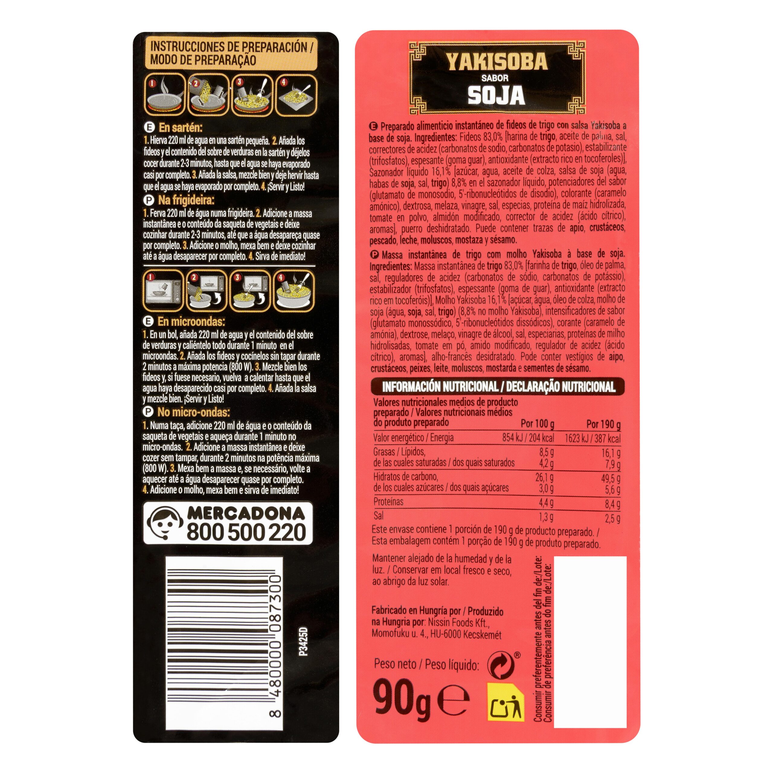 Fideos orientales Yakisoba sabor soja Hacendado típico del mercado español.